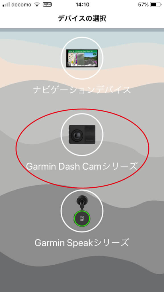次の画面では上から3つのアイコンが並んでいますので、2番目の「Garmin DashCamシリーズ」をクリックしてください。