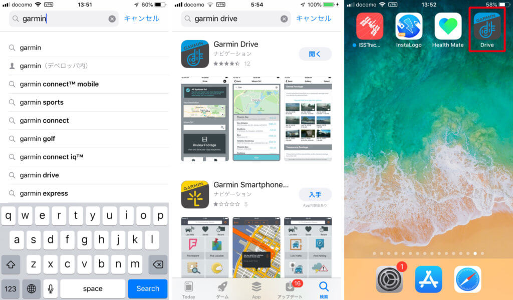 その検索ウィンドウに「garmin drive」と入力してください、すると直ぐ下に水色とグレーのアイコンのGarmin Driveが現れるので「入手」ボタンを押してアプリをダウンロードしてください。
