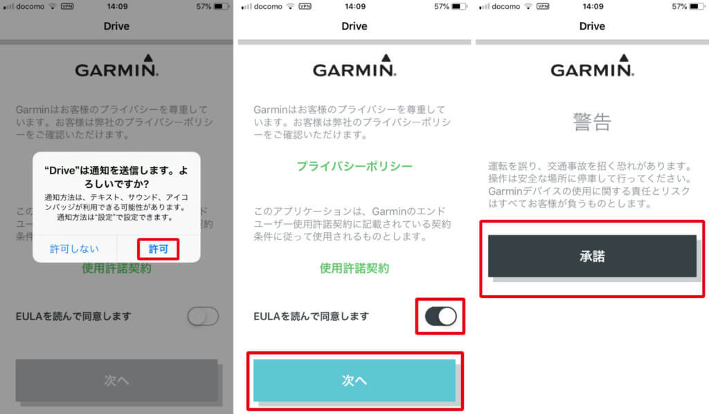 次ページでは「警告」が記載されています。「承諾」を押せばめでたくGarmin Driveの設定画面に移動できます。