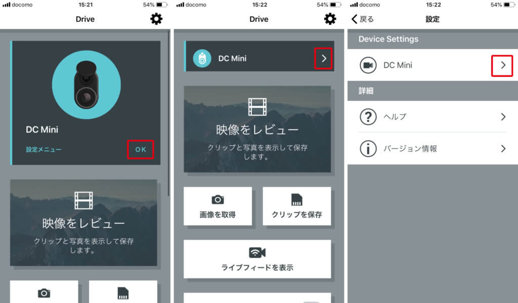 このボタンを押すと、ここでも「"Drive"Wi-Fiネットワーク"DC Mini-*****"に接続しようとしています。よろしいですか?」(*****は数字です)と聞いてくるので「接続」を押してください。