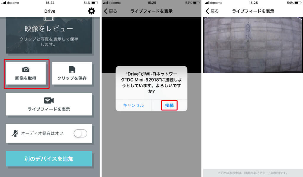 ボタンを押すと「"Drive"がWi-Fiネットワーク"DC Mini-*****"に接続しようとしています。宜しいですか?」と聞かれますので「接続」を押してください、すると現在の画像がスマホに保存されるのです。