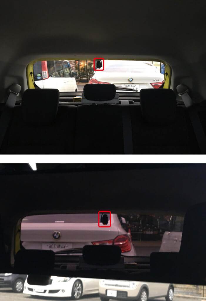 以下はリアウィンドウの画像とバックミラー越しの画像です、全く目立ちませんよね!