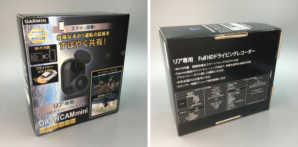 正面はごくごく普通ですが、背面にはDash Cam miniの仕様と機能表がプリントされています。
