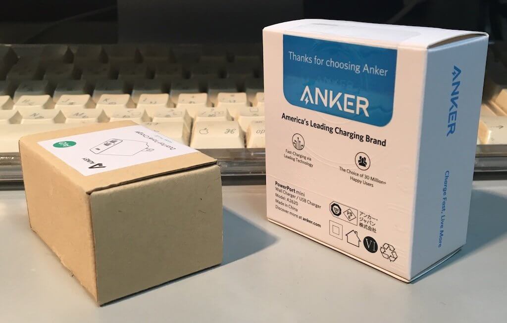 パッケージは非常に簡素です!茶色の地味な箱の大きさは「Anker PowerPort mini」の半分ほどです。