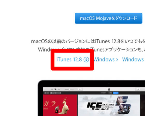その水色のボタンの下には小さな文字で「macOSの以前のバージョンにはiTUnes 12.8をいつでもダウンロードできます。Windowsパソコン向けのiTunesアプリケーションも、こちらからどうぞ。」