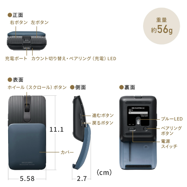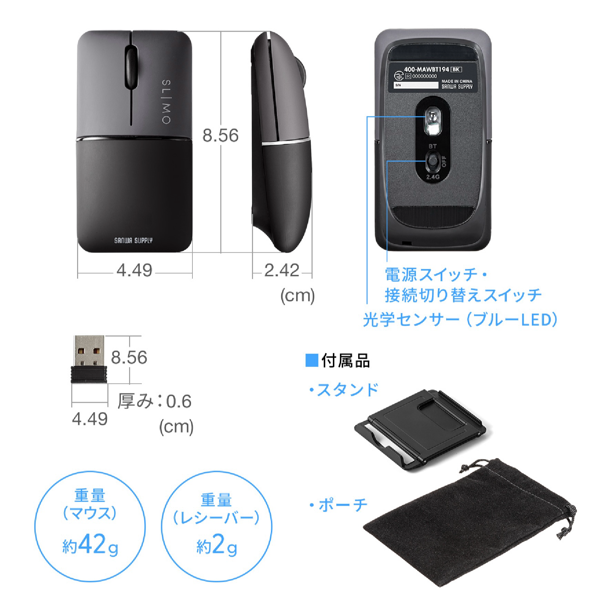 400-MAWBT194NV本体は42gと軽量、寸法は縦8.56cm 横4.49cm 高さ2.42cmと非常にコンパクトです。