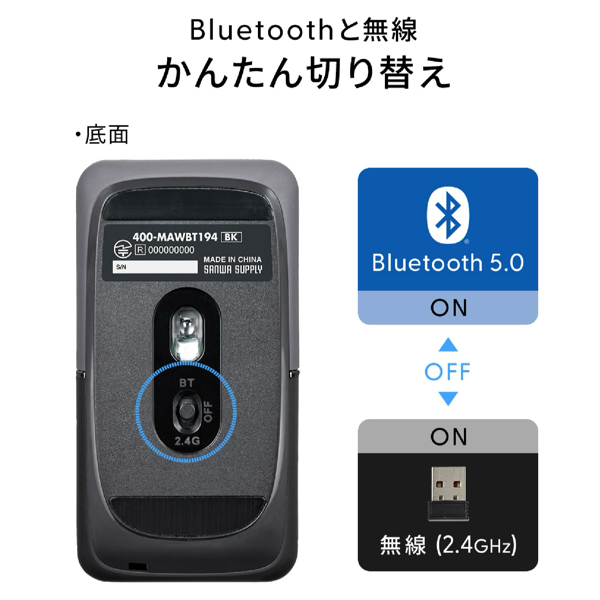 この400-MAWBT194NVはBluetooth5.0と、2.4GHzのワイヤレス方式を選択できます。