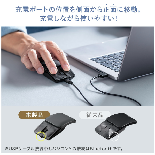 ケーブルコネクタはマウスの先端にあるので、充電しながら普通の有線マウスの感覚で使用できます。
