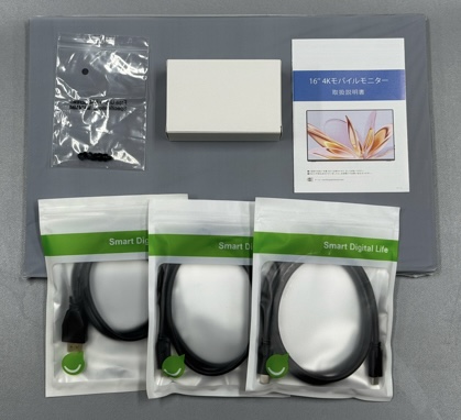 付属品はUSB-Cケーブル×2、mini-HDMIケーブル、電源アダプタ、保護ケース、説明書、そしてサービス品のネジが同梱されています。