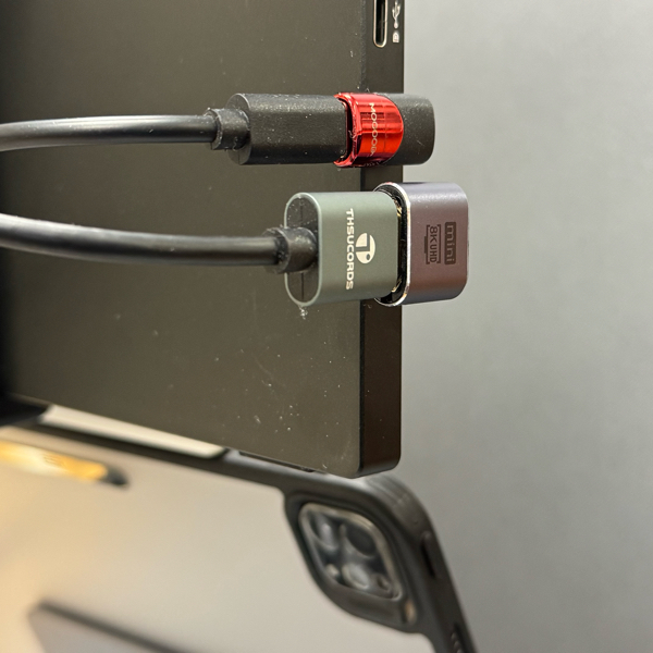給電不足のまま使用すると輝度が下がったり、画面がチラつく可能性があるため、45W〜60Wクラスの充電器を用意しておくと安心です。