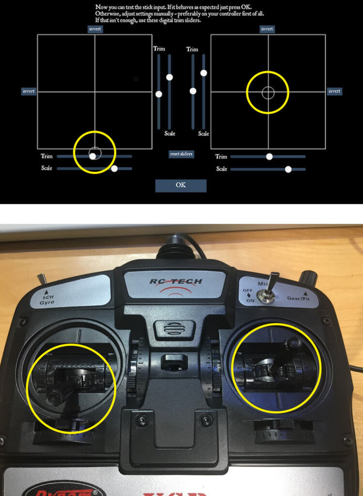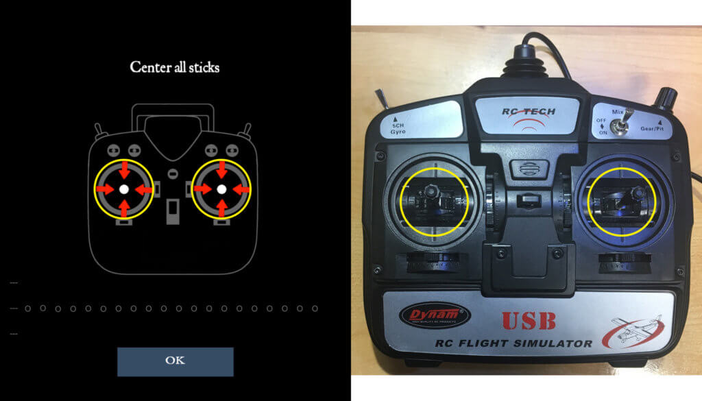 上記の「USB接続プロポ型コントローラー」の設定と同じようにコントローラーのキャリブレートを行います。