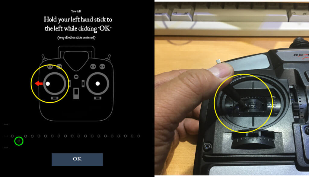 ② 次に左のスティックを左に傾けます、そしてそのままの状態で「OK」をクリックします。