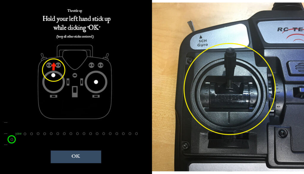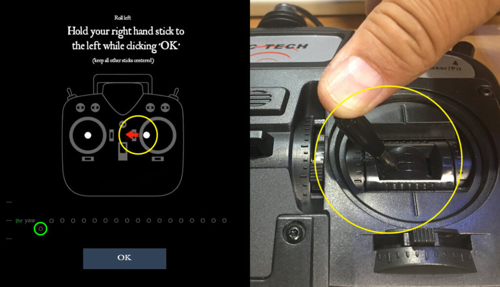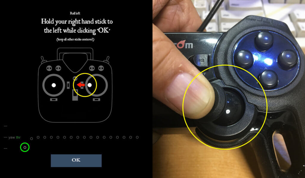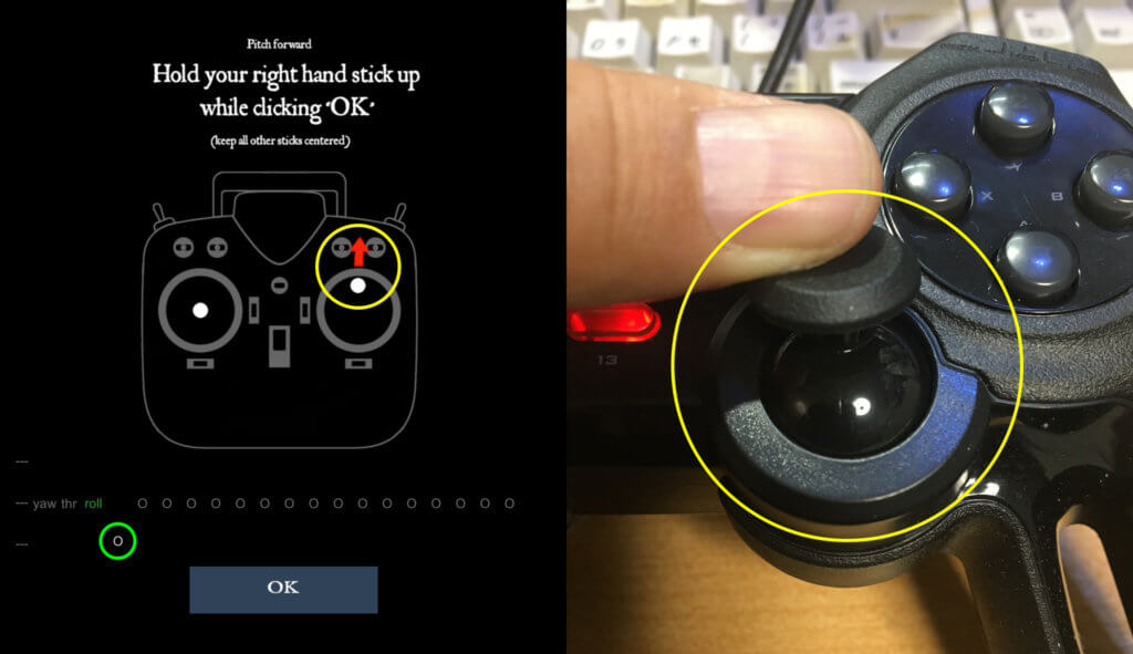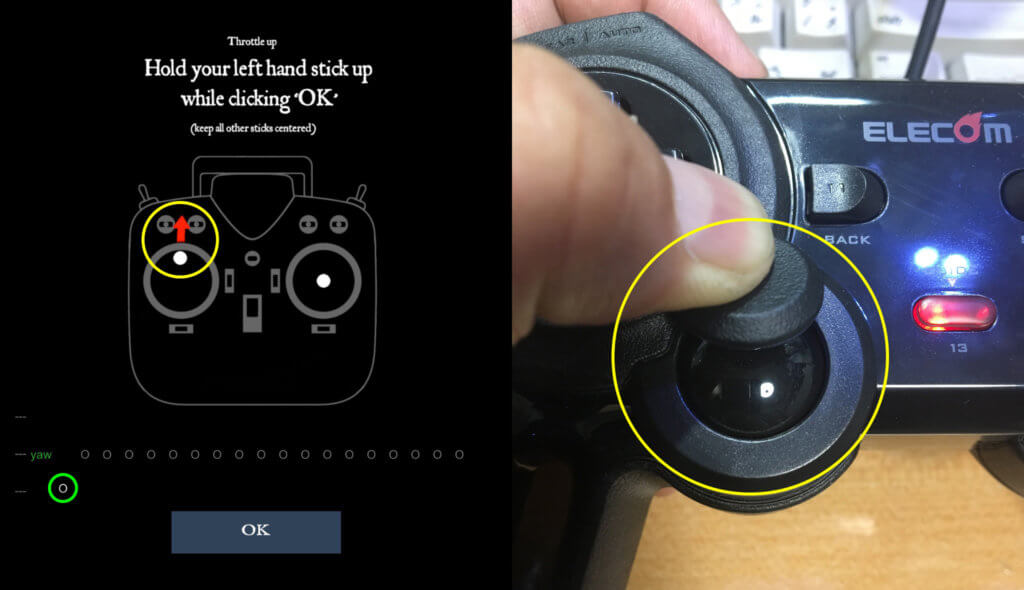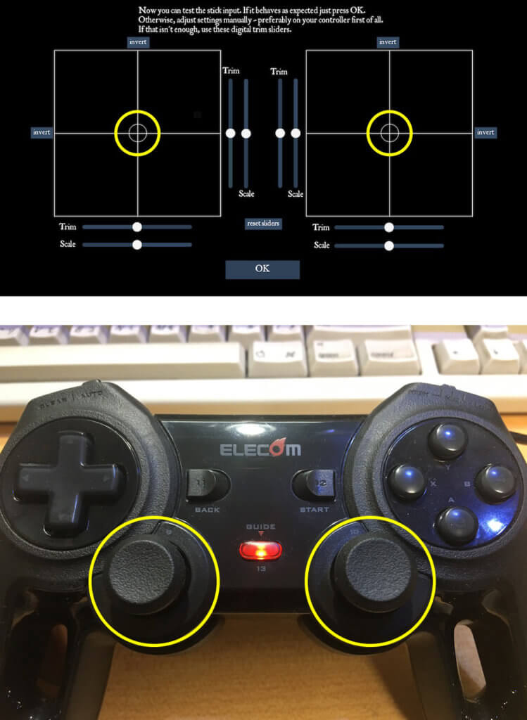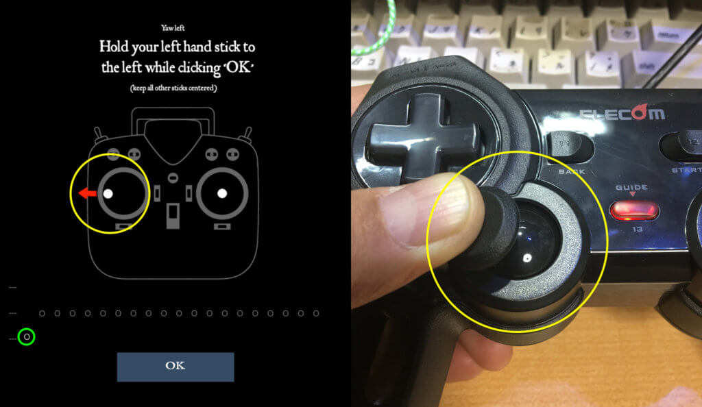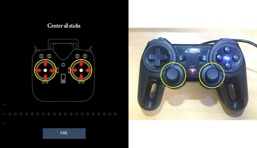 このゲームパッド型コントローラーはスティックがバネで中央に来てしまうので、指で上まで押し上げながら「OK」を押します。