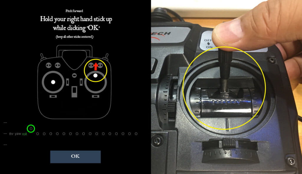 ⑤ 最後に右スティックを一番上に上げて「OK」ボタンをクリックしてください。