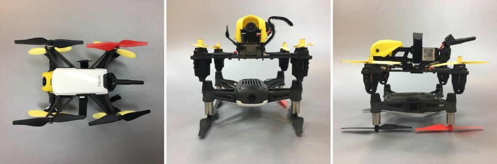 Telloの左後方の赤いプロペラは、先日飛行中に落下させて紛失した黒いプロペラの代わりに装着してあります。
