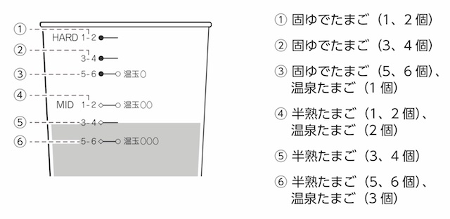 固ゆでたまご、半熟たまご、温泉たまごそれぞれの個数によっても置く場所が決まっていますね。