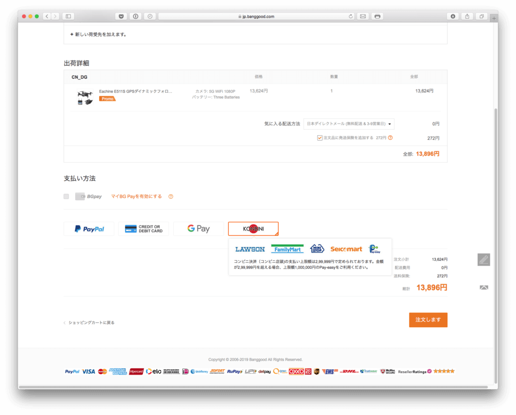 「支払い方法」を見ると画面中央に「PayPal」「CREDIT OR DEBIT CARD」「G Pay」「KONBINI」が並んでいます。