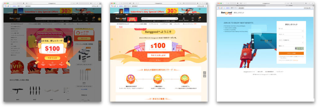 いきなり「$100プレゼント」と表示されていますので興味のある方はクリックして下さい。すると真ん中のページが表示され、画面中央の「今すぐ入手します」をクリックすると写真右の登録画面が表示されます。