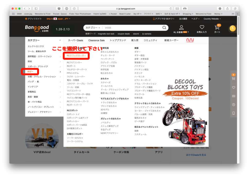 トップページのBanggood.comアイコンの下に「カテゴリ−」がありますのでクリックして「ホビー」を選択してみて下さい。以下の様な物凄いジャンルが細かくしかも分かり易く整理されていますね!