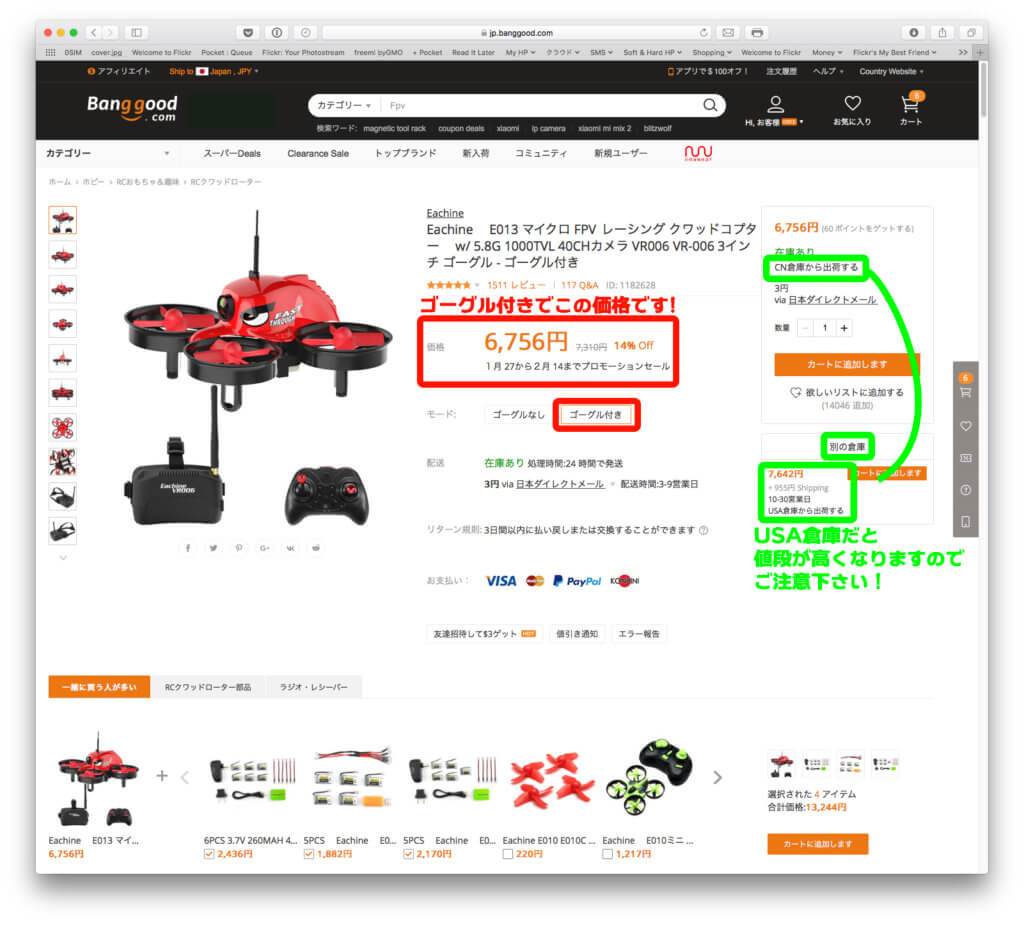 僕は今回「5G wifi 1080P」で「Three Batteries」を選びました。バッテリー3個あればかなり遊べますからね!赤で囲んだ部分です。このモデルは日本でも販売していますが、価格はこのほぼ倍するのです。