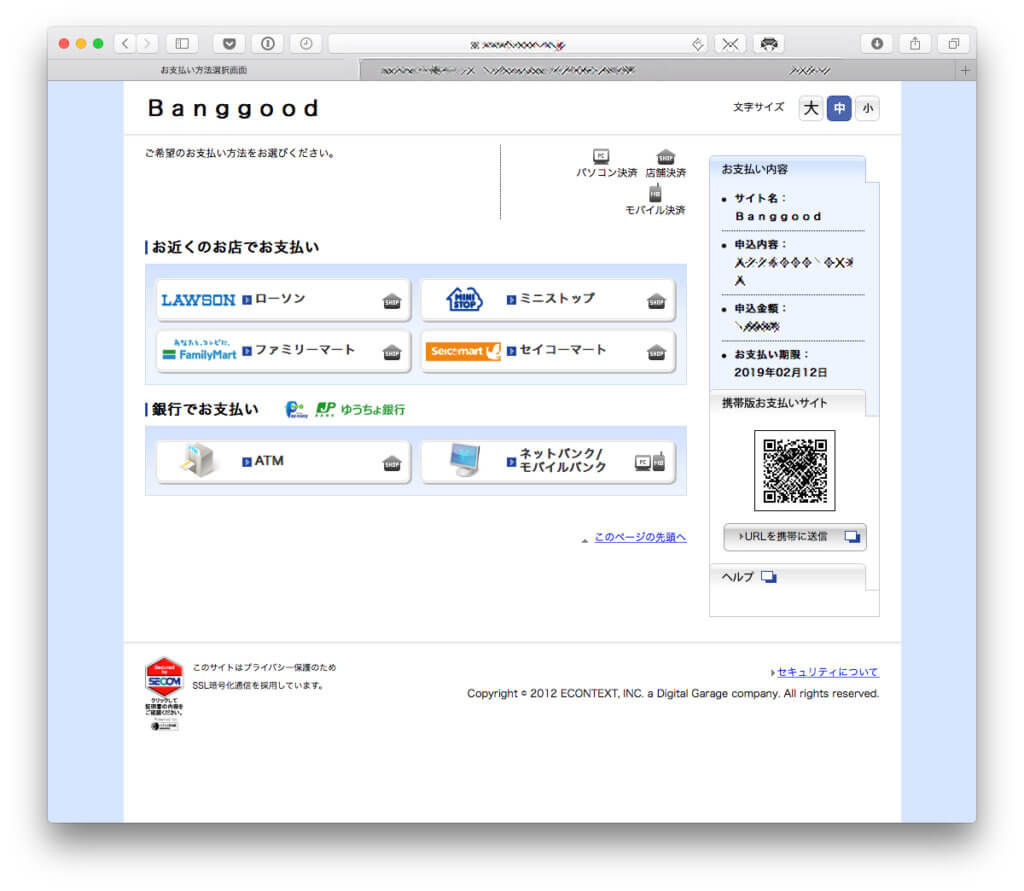 では「KONBINI」をクリックしてみましょう。すると何と「お近くのお店でお支払い」の下に4つのコンビニボタンがあり、その下には銀行からも支払えるボタンが。素晴らしい!