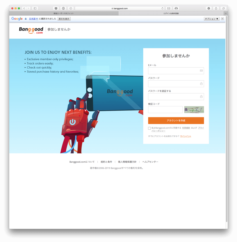 先ずはBanggoodにユーザー登録を。