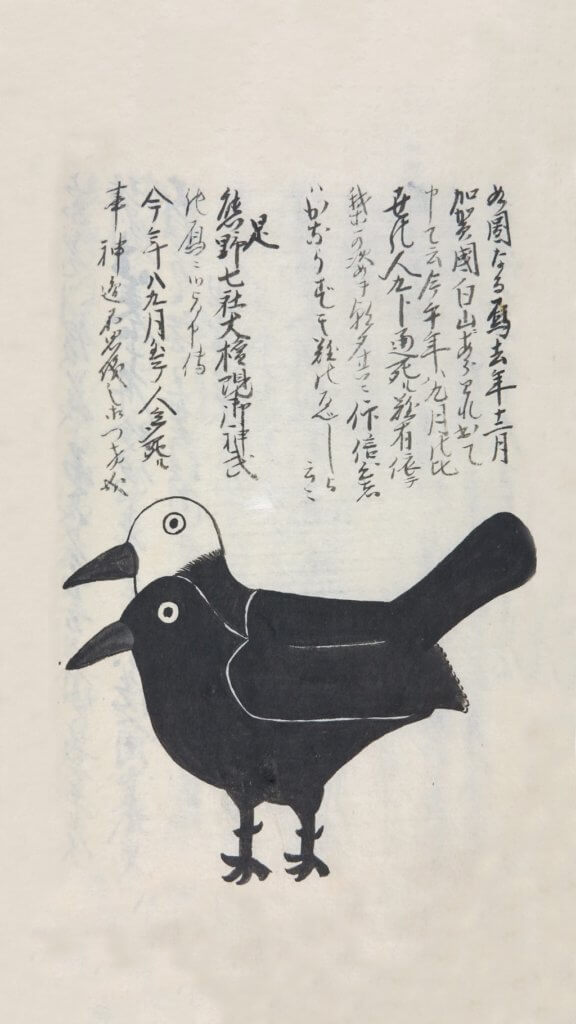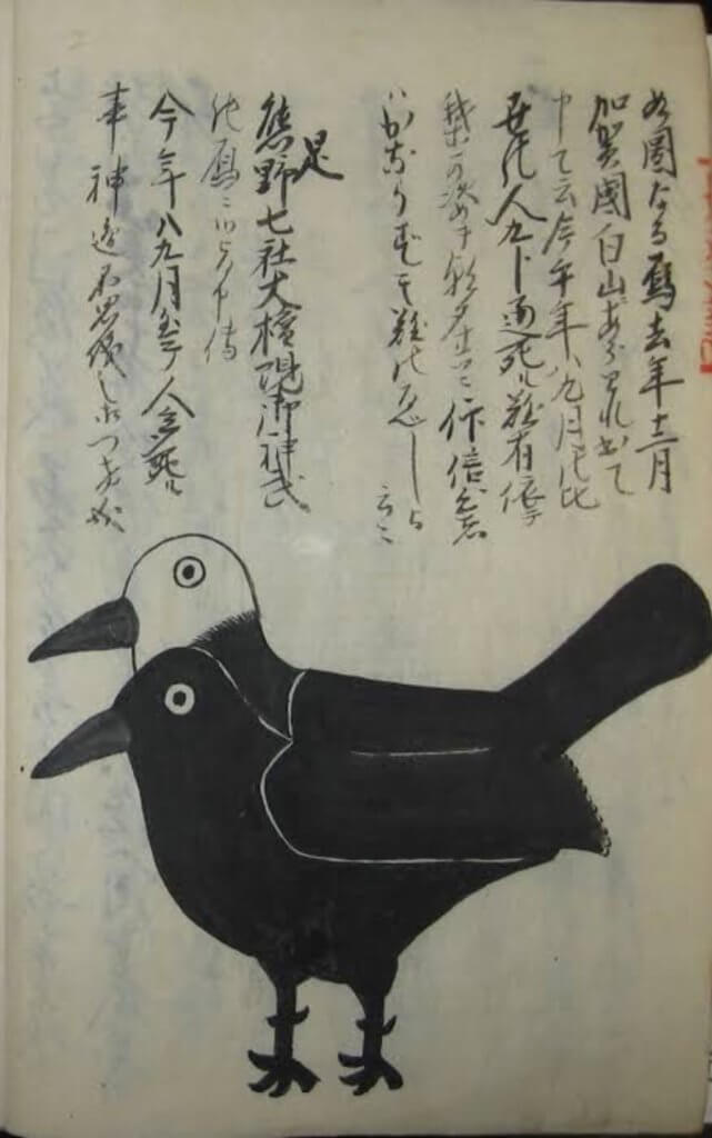その噂とは...図のような双頭の烏が、コレラが流行る前年の12月に加賀国(現在の石川県)に現れました。