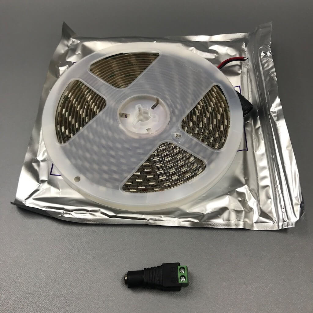 本体は綺麗に巻き取られて届きます。他に電源ケーブルとAC-DCコンバーターとコネクタが付属しています。