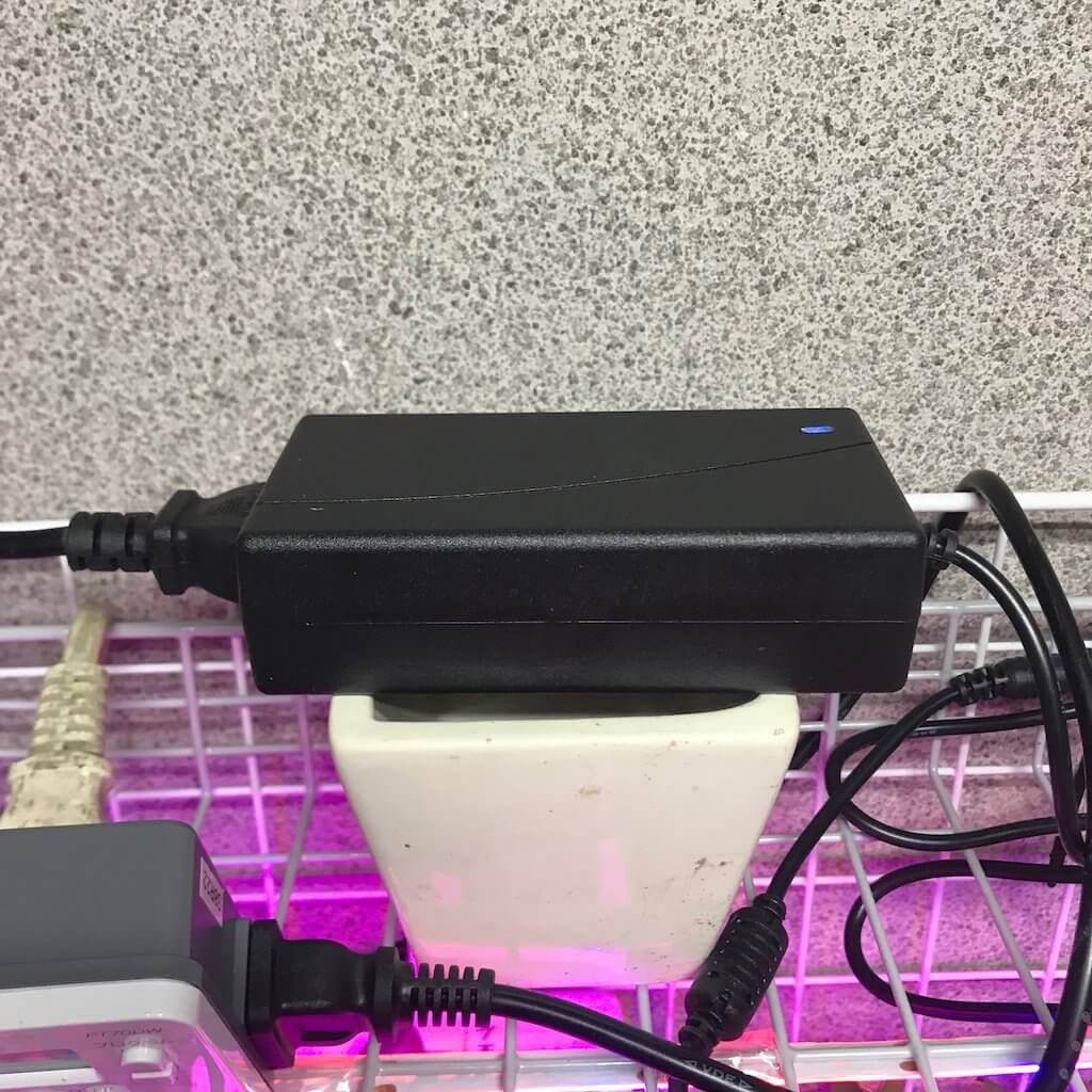 電源部がかなり熱くなるのです。手で触れない程は熱くなりませんが、念の為に陶器の植木鉢の上に載せておくことにしました。