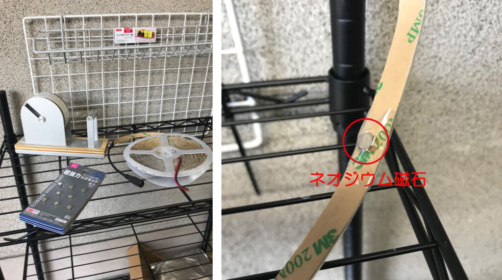 当初は背面の3Mのテープを使わずにダイソーのネオジウム磁石をテープに貼り、その力で金属ラックに装着しようと考えました。