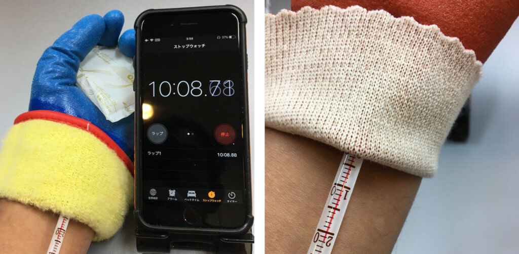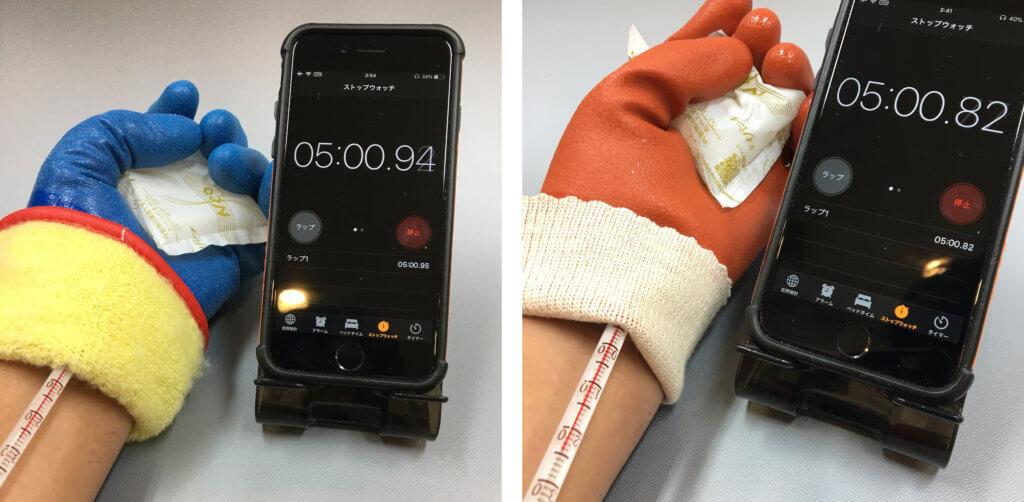 ・その時のグローブ内の保冷剤が当たっている部分の温度を測る。