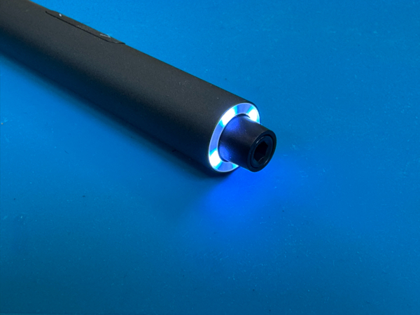 本体の先端部分には駆動スイッチと連動したLEDランプが面で装備されています。下の写真では4つの光源部が光って見えますが、実際は面光源になるので非常に使いやすいです。